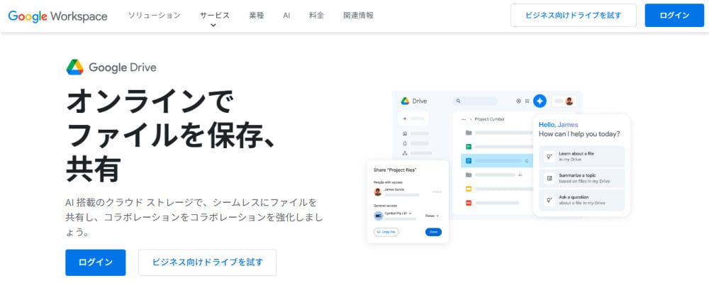 Google Drive公式サイト:https://workspace.google.com/intl/ja/products/drive/
